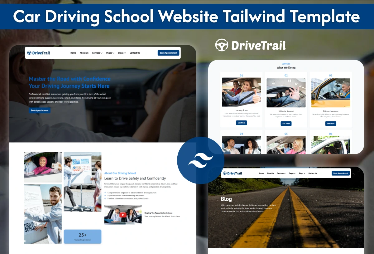 Drivetrail is a dynamic HTML template free option built specifically for driving schools and automotive education services. Powered by Tailwind CSS, it offers both aesthetic appeal and functional excellence.